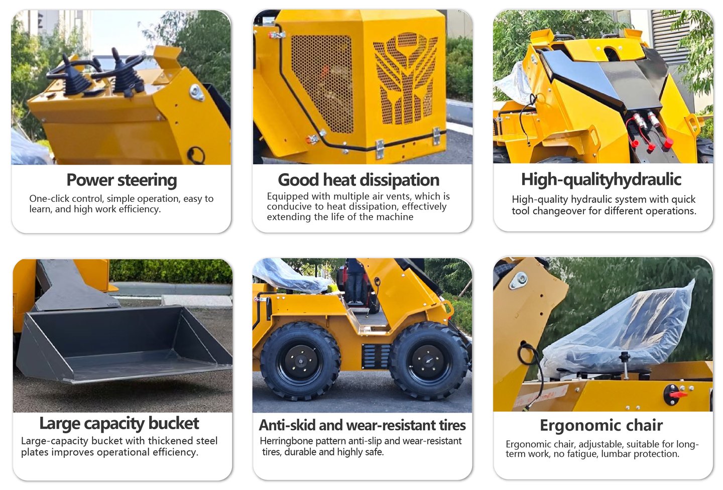 Comfortable seats, ergonomic joysticks, and centralized maintenance points ensure operator comfort during long working hours and significantly reduce maintenance costs.